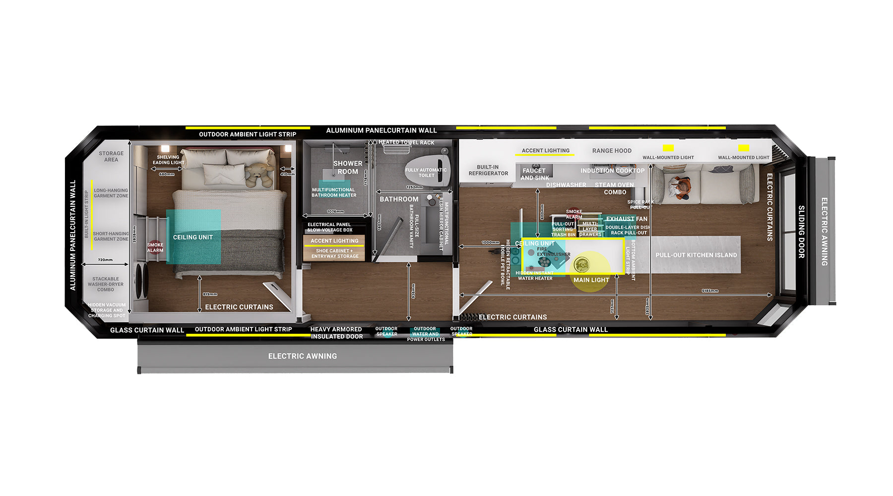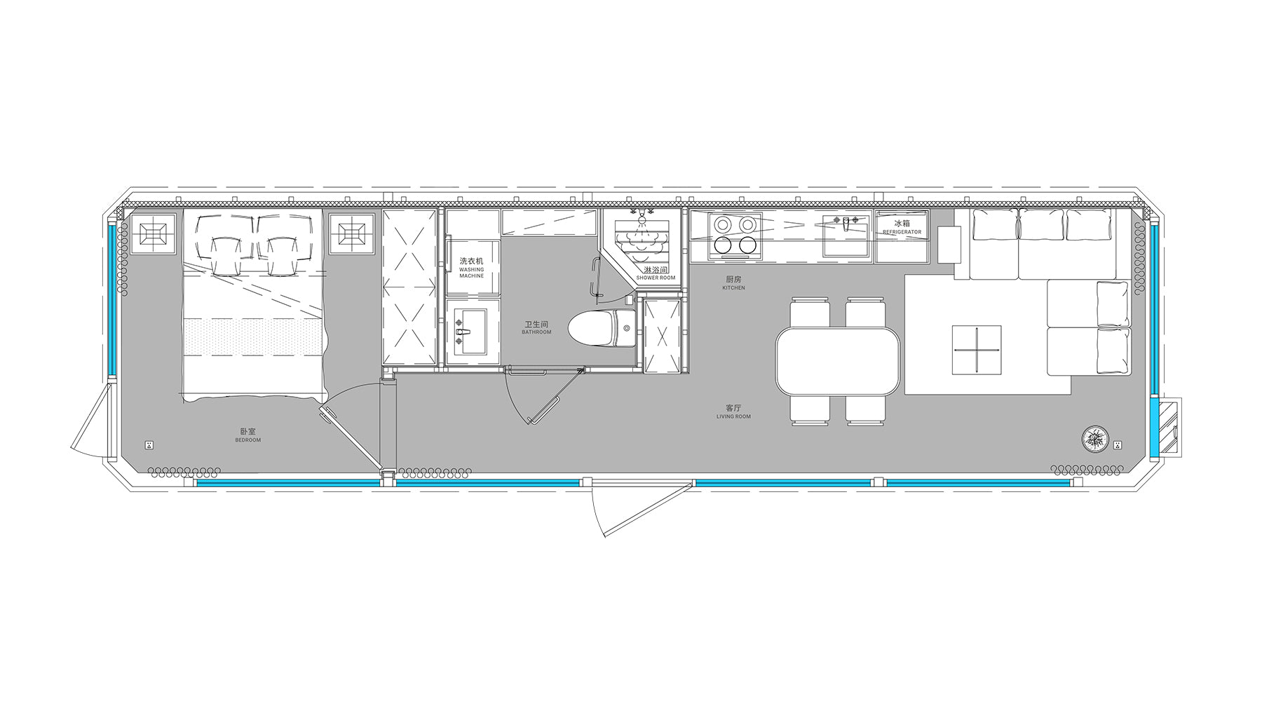 The interior integrates a bedroom, bathroom, living room, and a kitchen pre-installation area, fulfilling complete living needs while maintaining a compact and efficient spatial layout.