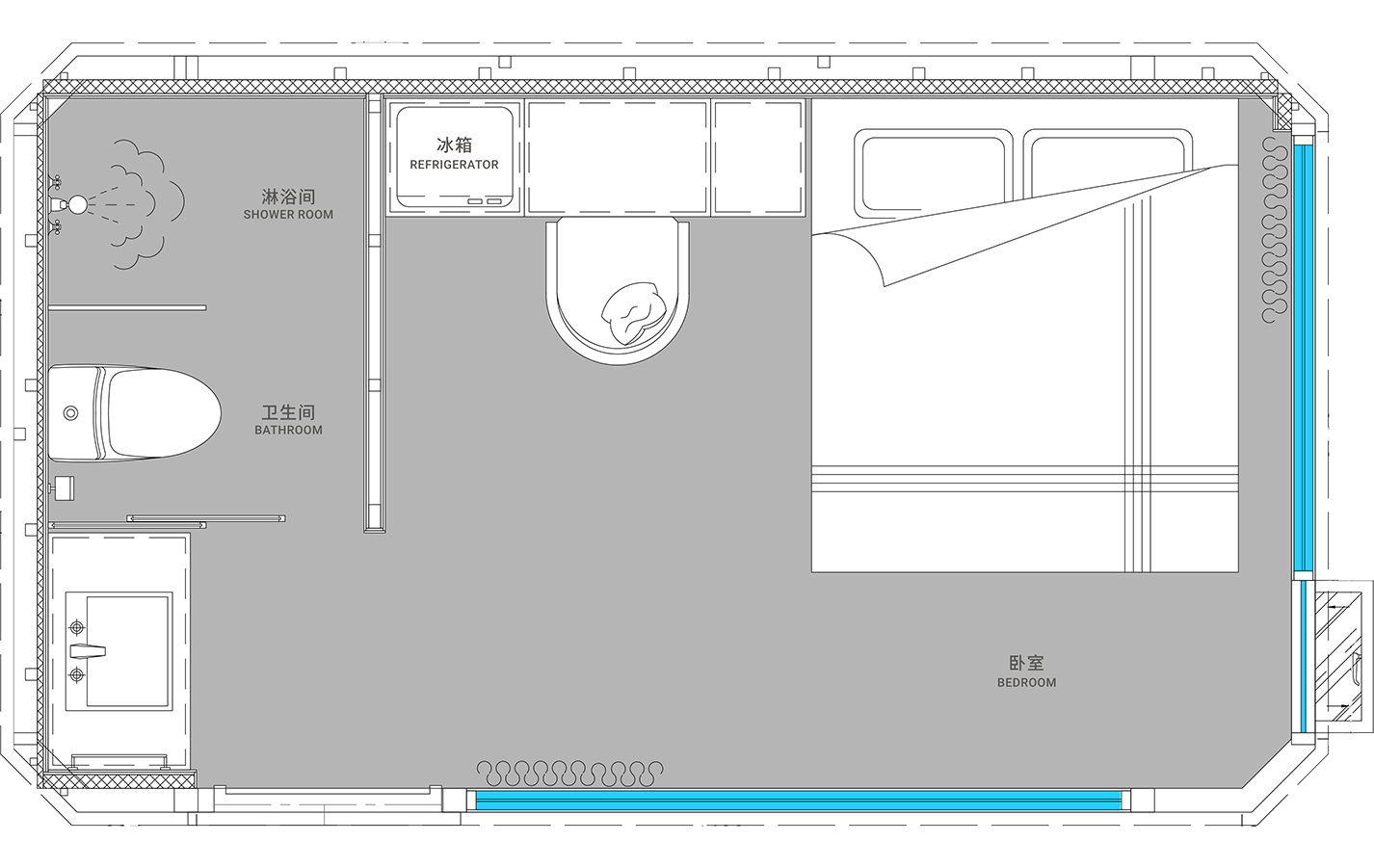 The walls, interior ceiling, and floor of the ETONG Space Capsule homes utilize 80mm-thick aluminum structural modules filled with high-quality PIR/XPS insulation material. The module dimensions can be flexibly determined based on layout plans, while being designed for easy transportation, assembly, and handling, effectively reducing construction and transportation costs.