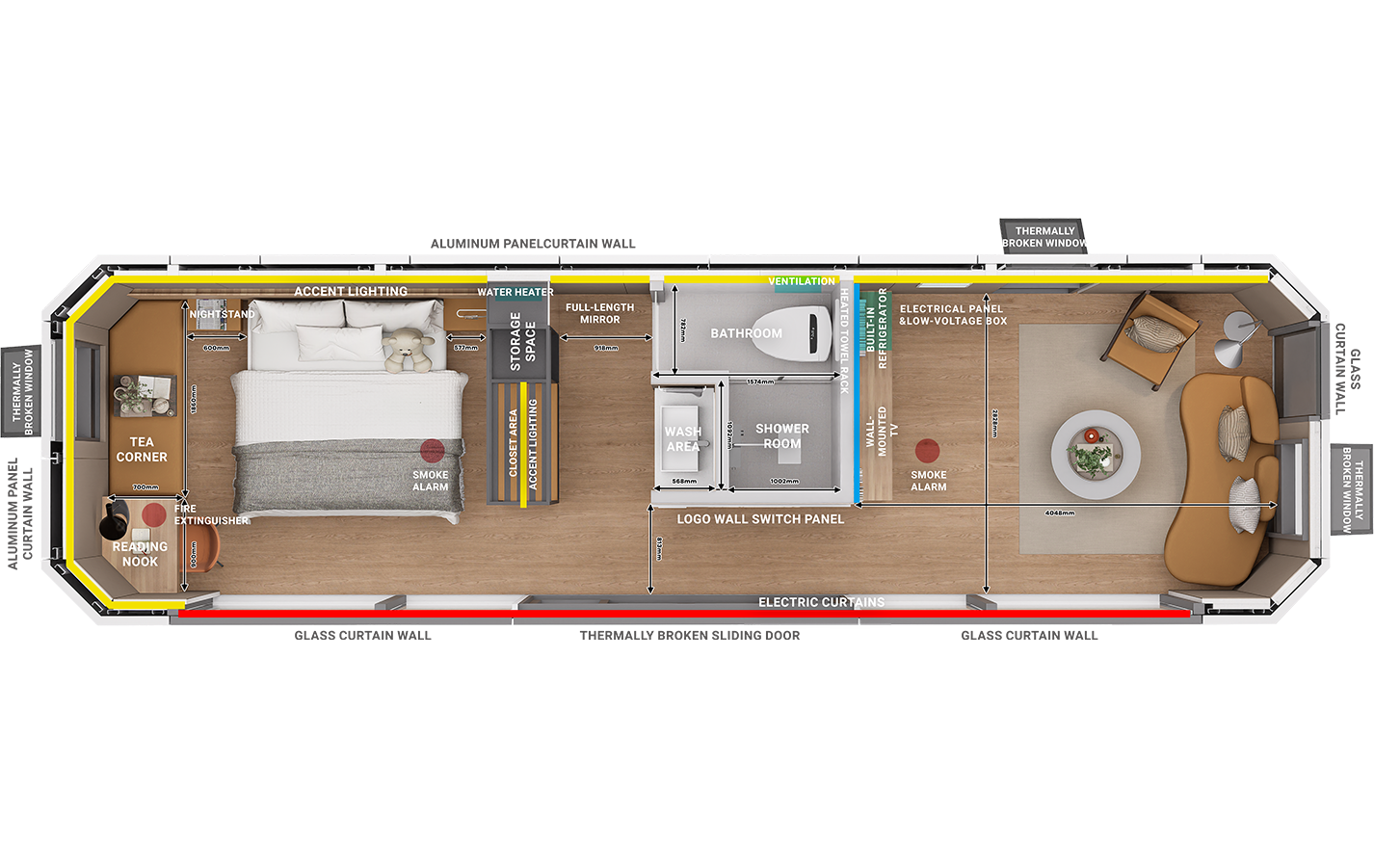 • Safety Features: Independent smoke alarm in the bedroom, with a concealed fire extinguisher beneath the desk to enhance safety during nighttime use or unattended periods.