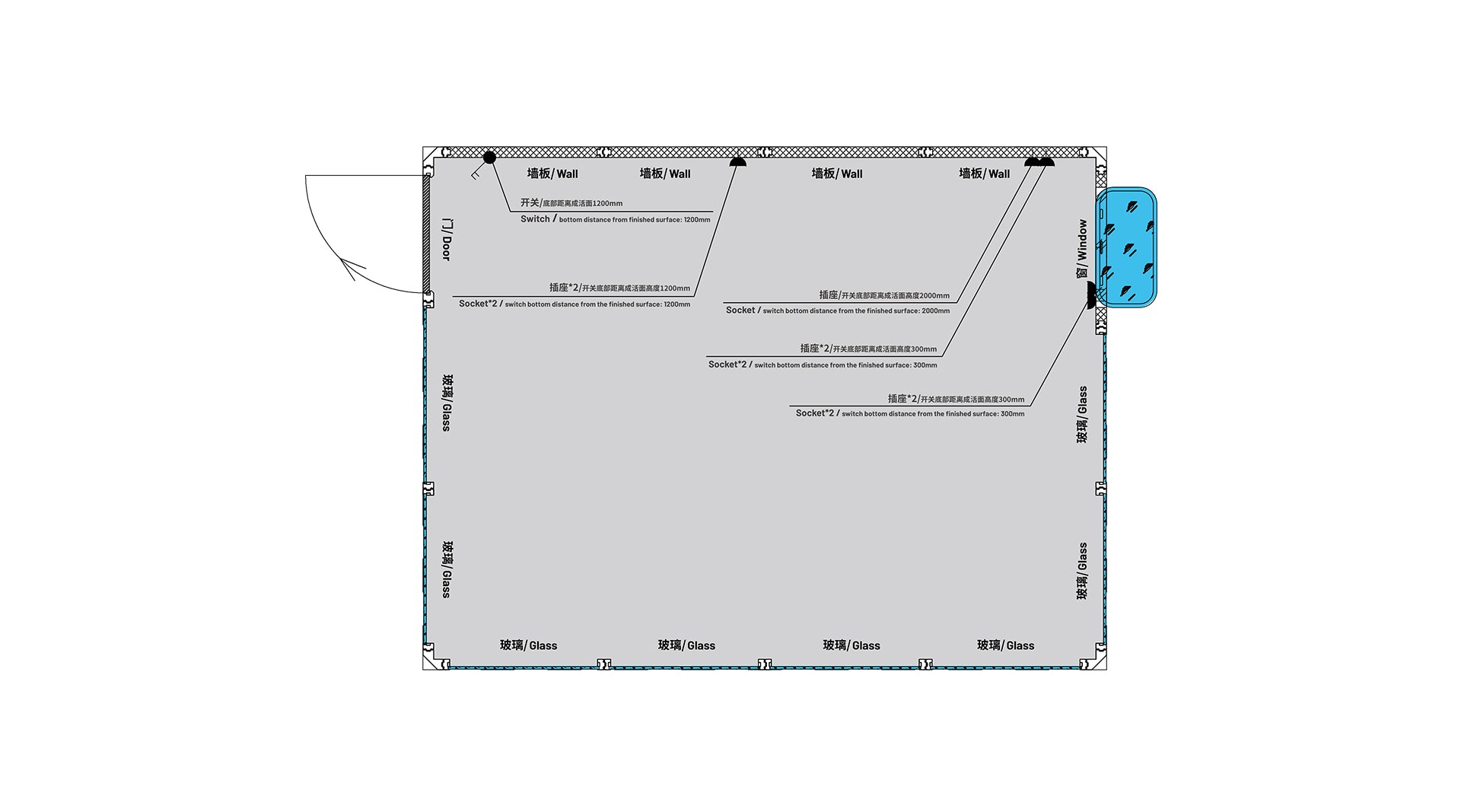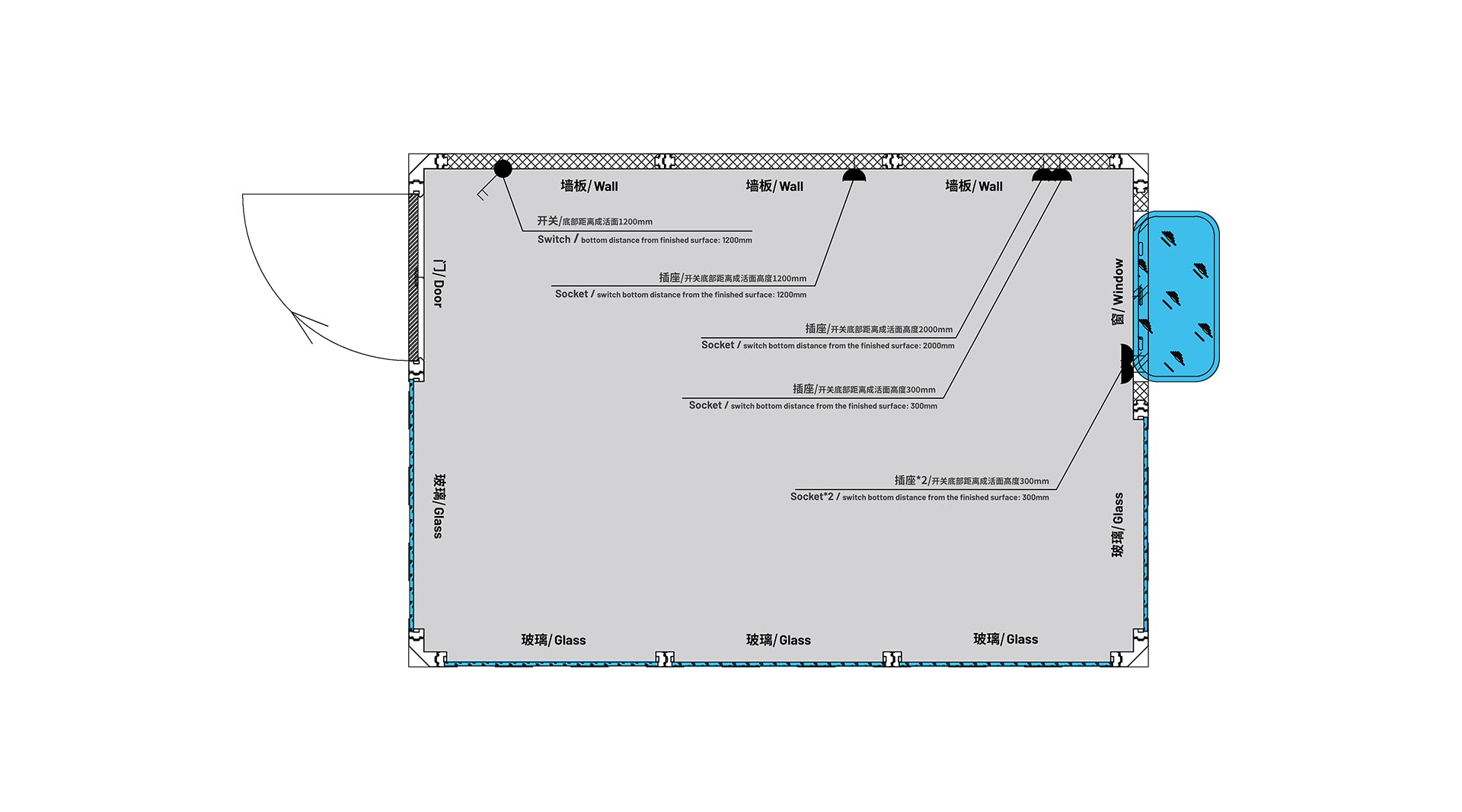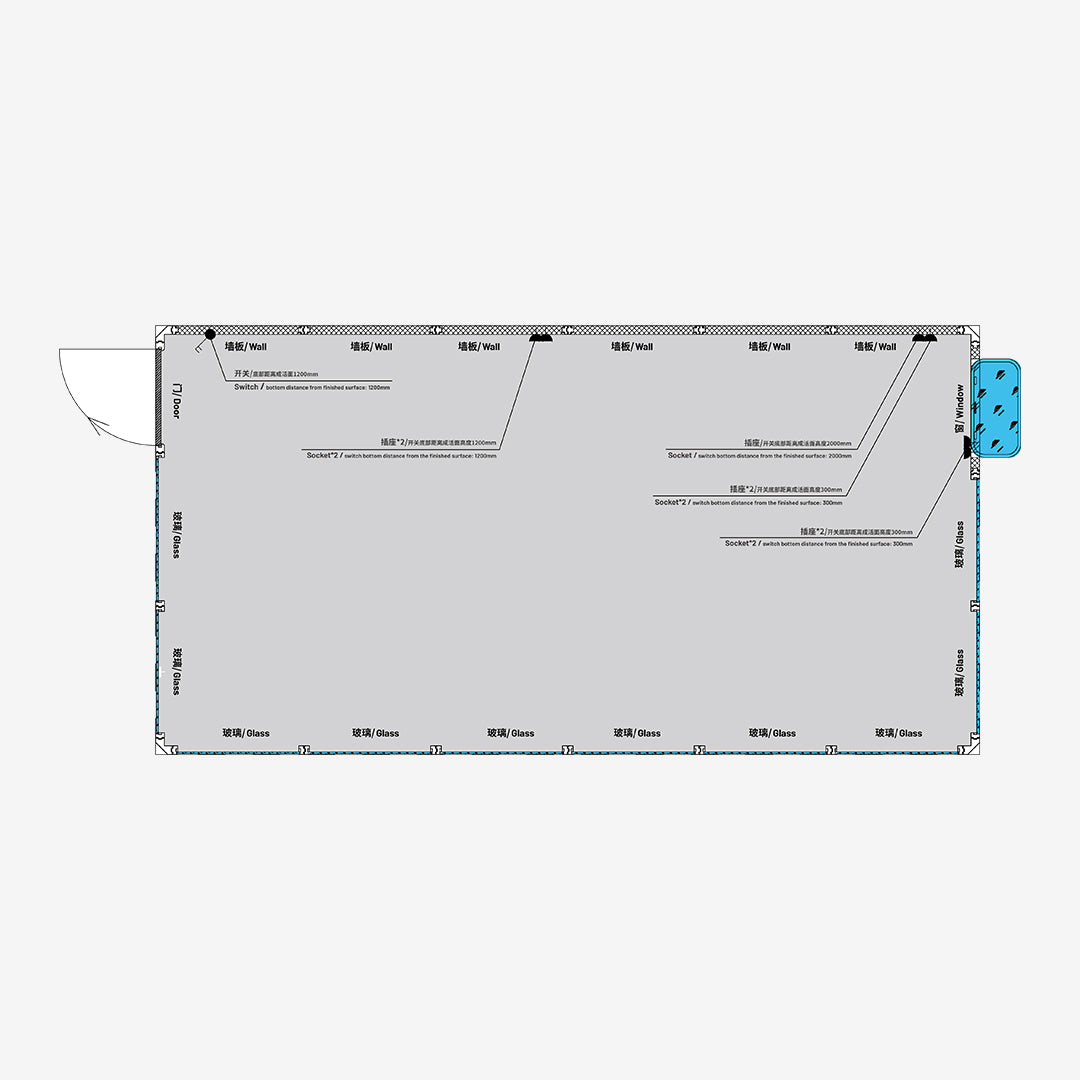 2D Layout Diagram of Interior Space: Plan flexibly based on labeled positions of walls, doors, and windows, or achieve further customization by modifying base configurations.